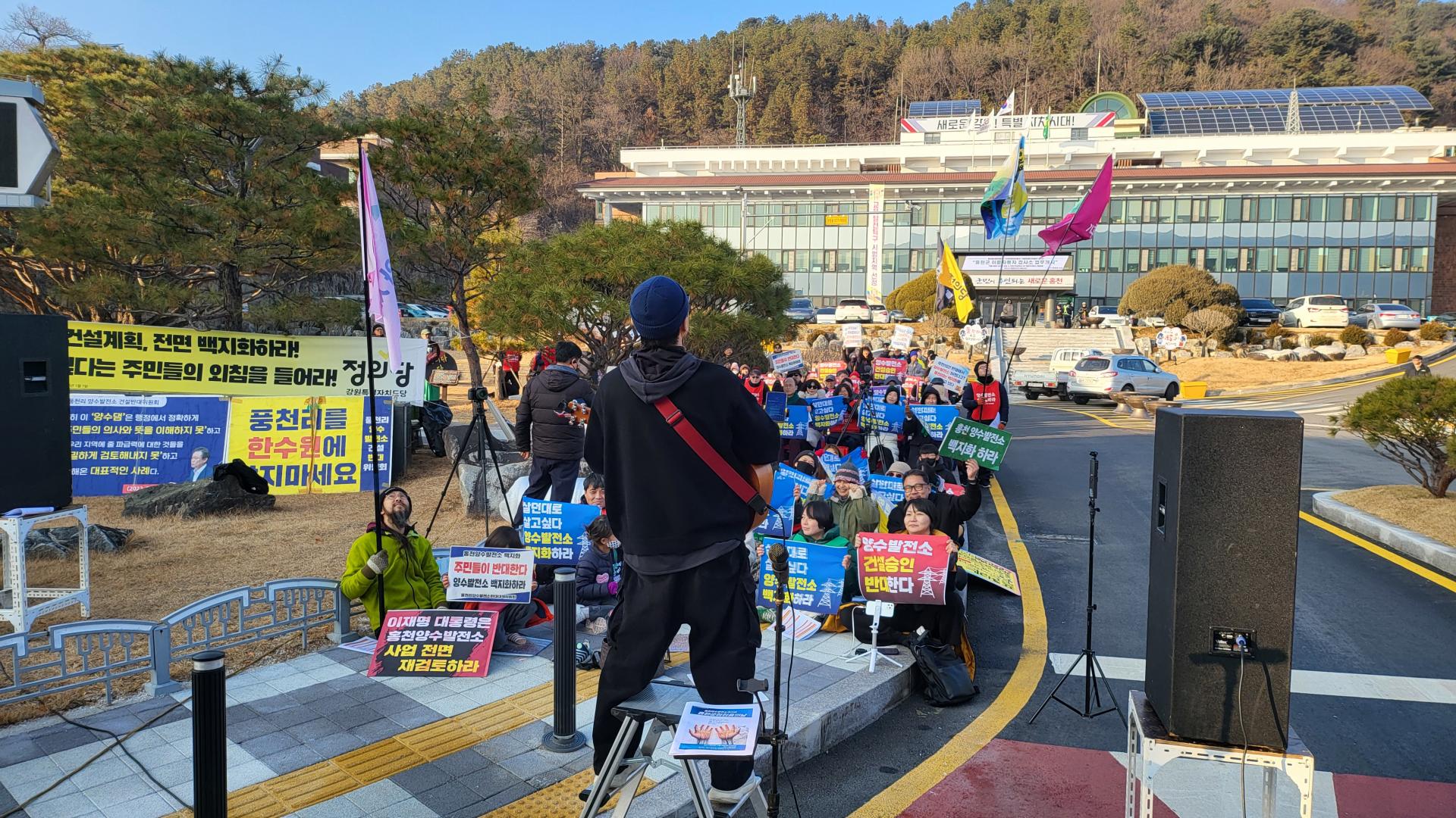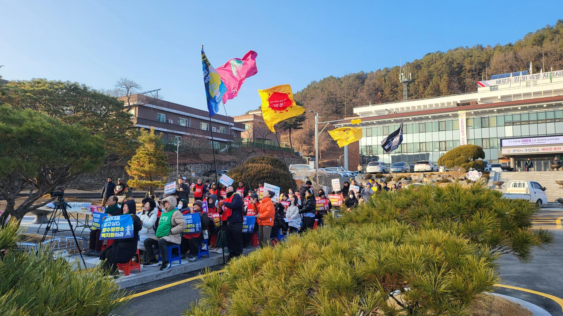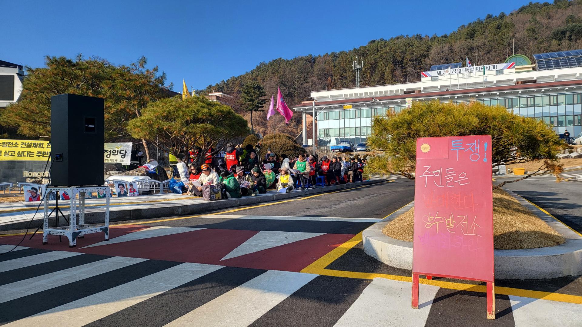각지에서 100여명의 연대자들이 풍천리 주민들의 투쟁을 지지하고 함께 싸우고자 홍천군청 앞에 모였습니다. 그동안 풍천리 주민들이 양수발전소 백지화를 위해 외롭게 싸우는 듯하였지만 풍천리의 잣나무 숲을 파괴하며 지어지는 양수발전소의 폐해가 단지 풍천리만의 문제가 아니라 전국에 미칠 문제이기에 어디선가 연대와 응원을 봏내고 있을 동지들이 있을 것이라는 상상이 그 실체로 드러났습니다. 무엇보다 모인 연대자들을 통해 풍천리 주민들이 많은 위로와 힘을 얻는 시간이었음이 분명하였습니다. 그래서인지 장시간 이어지는 집회에도 풍천리 주민들은 조금도 지치는 기색을 보이지 않았습니다. 집회를 마치고 홍천군 신영재군수 면담을 위해 군청으로 찾아 갔지만 군수는 부재라면서 담당 국장이 막아서는 바람에 기 시간동안 군청 로비에서는 군수 면담을 요구하며 농성을 이어 갔습니다.
