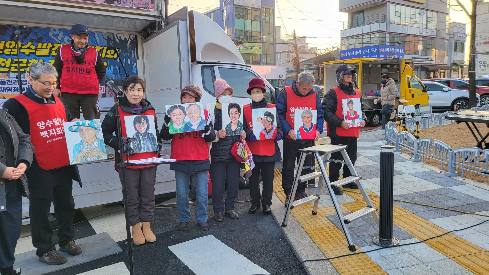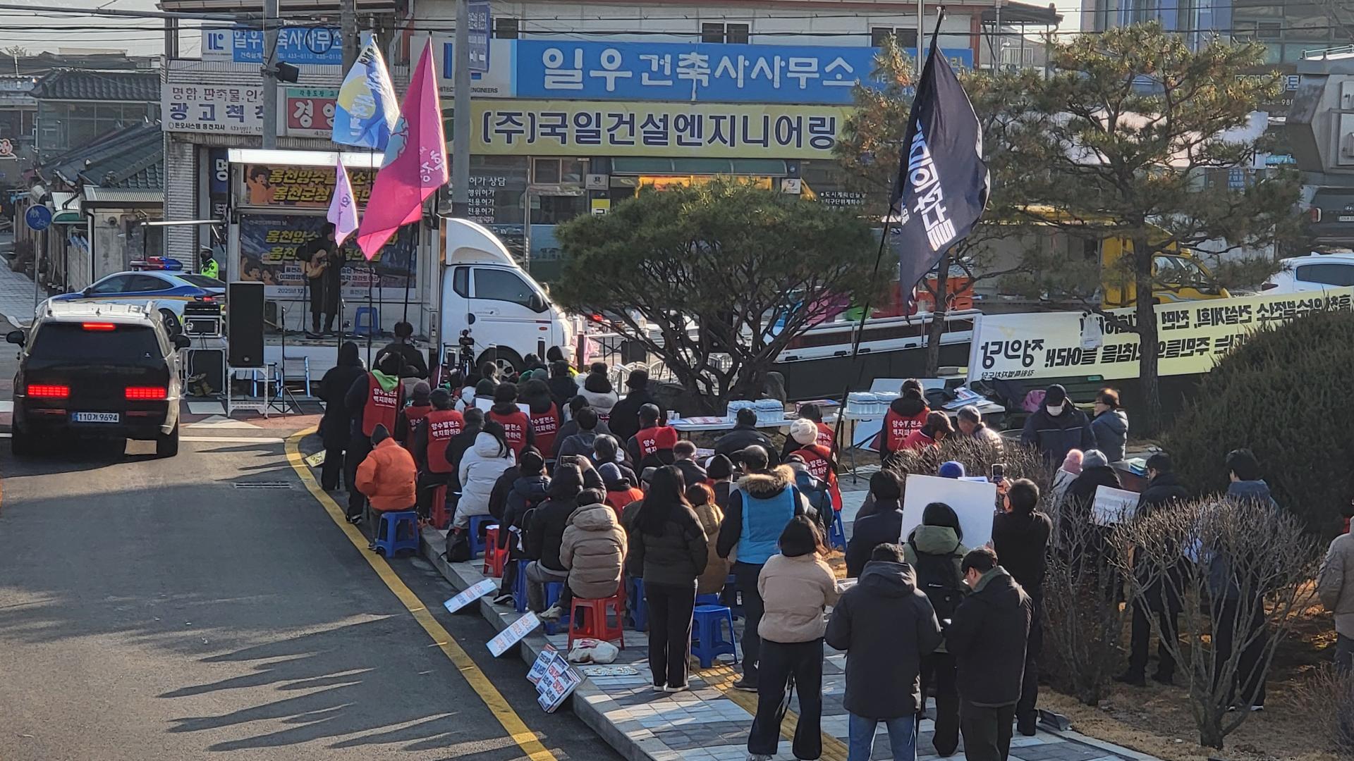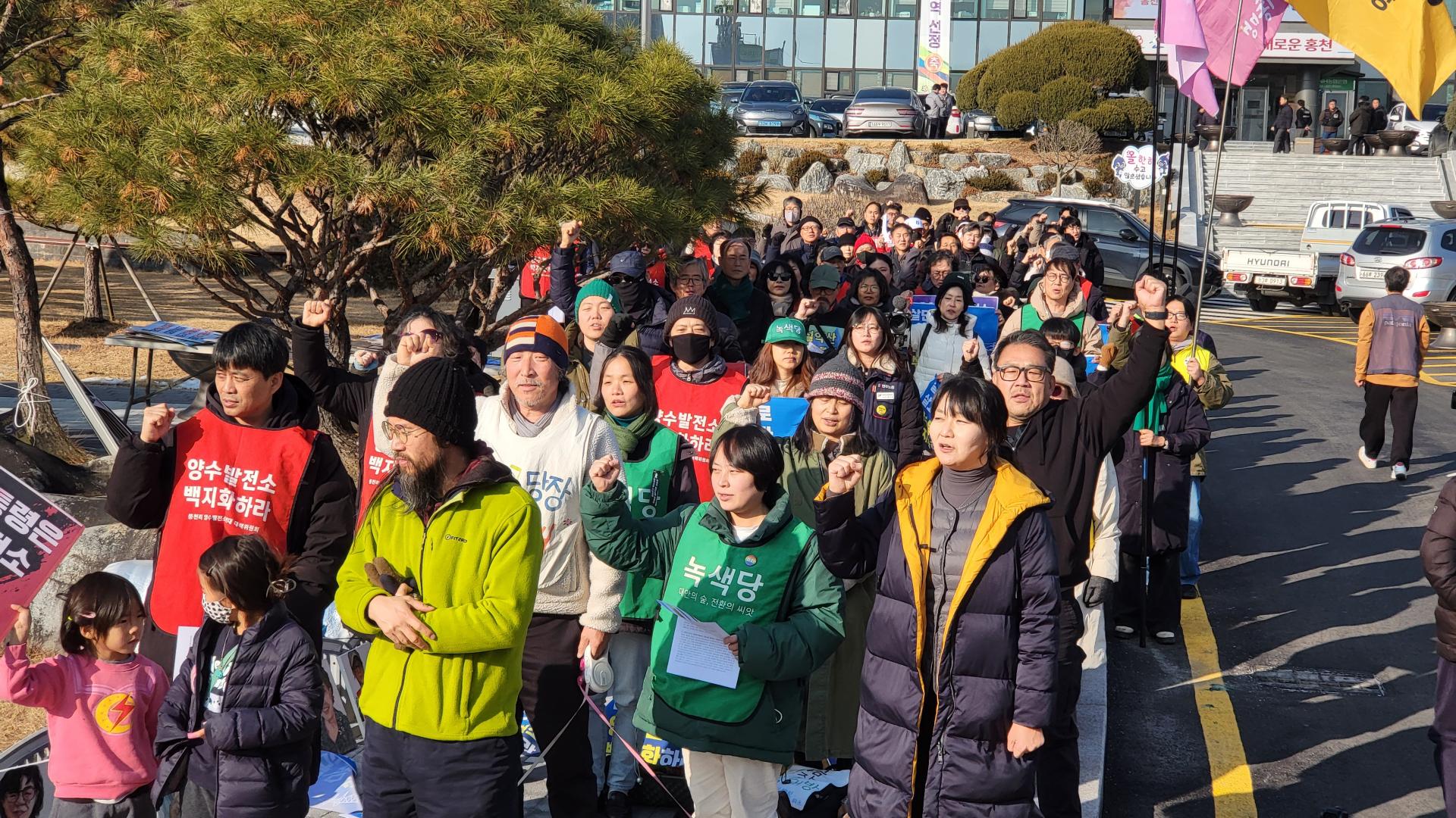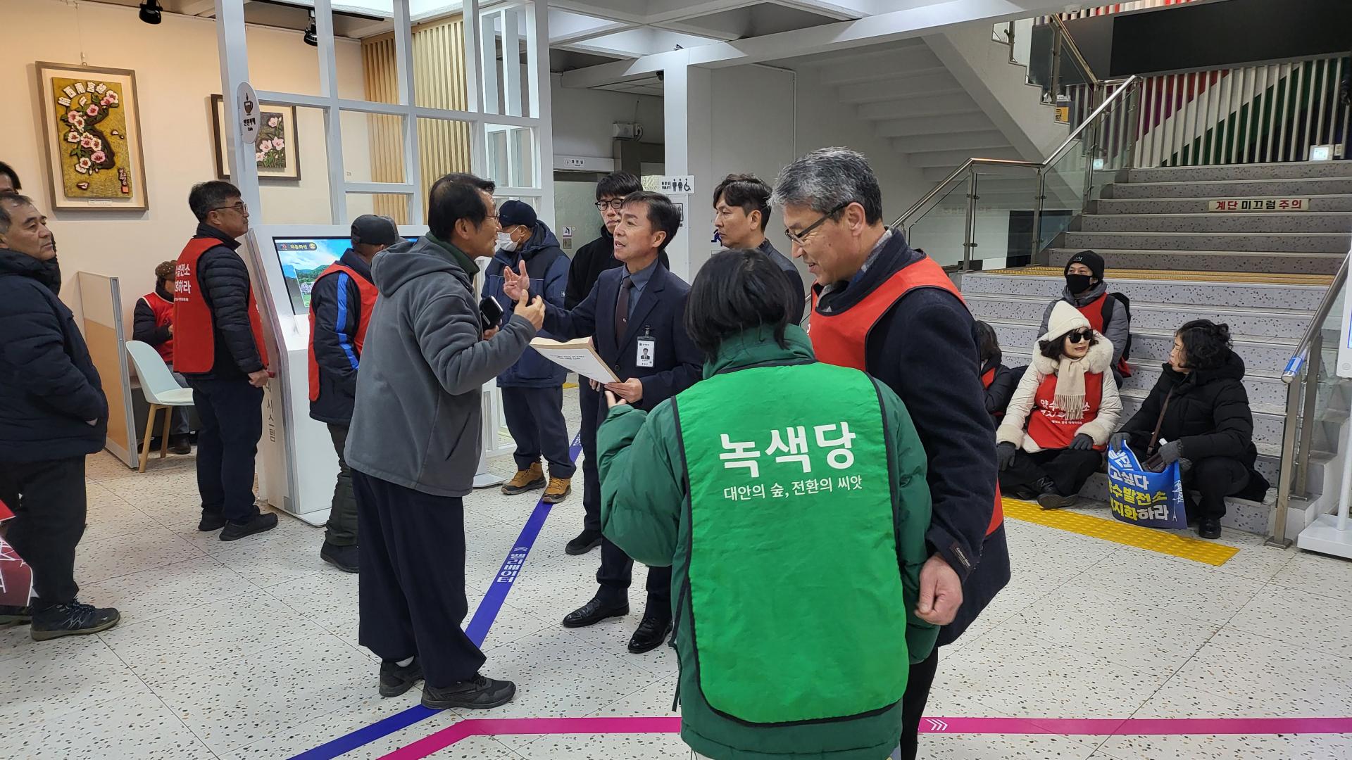 각지에서 100여명의 연대자들이 풍천리 주민들의 투쟁을 지지하고 함께 싸우고자 홍천군청 앞에 모였습니다. 그동안 풍천리 주민들이 양수발전소 백지화를 위해 외롭게 싸우는 듯하였지만 풍천리의 잣나무 숲을 파괴하며 지어지는 양수발전소의 폐해가 단지 풍천리만의 문제가 아니라 전국에 미칠 문제이기에 어디선가 연대와 응원을 봏내고 있을 동지들이 있을 것이라는 상상이 그 실체로 드러났습니다. 무엇보다 모인 연대자들을 통해 풍천리 주민들이 많은 위로와 힘을 얻는 시간이었음이 분명하였습니다. 그래서인지 장시간 이어지는 집회에도 풍천리 주민들은 조금도 지치는 기색을 보이지 않았습니다. 집회를 마치고 홍천군 신영재군수 면담을 위해 군청으로 찾아 갔지만 군수는 부재라면서 담당 국장이 막아서는 바람에 기 시간동안 군청 로비에서는 군수 면담을 요구하며 농성을 이어 갔습니다.