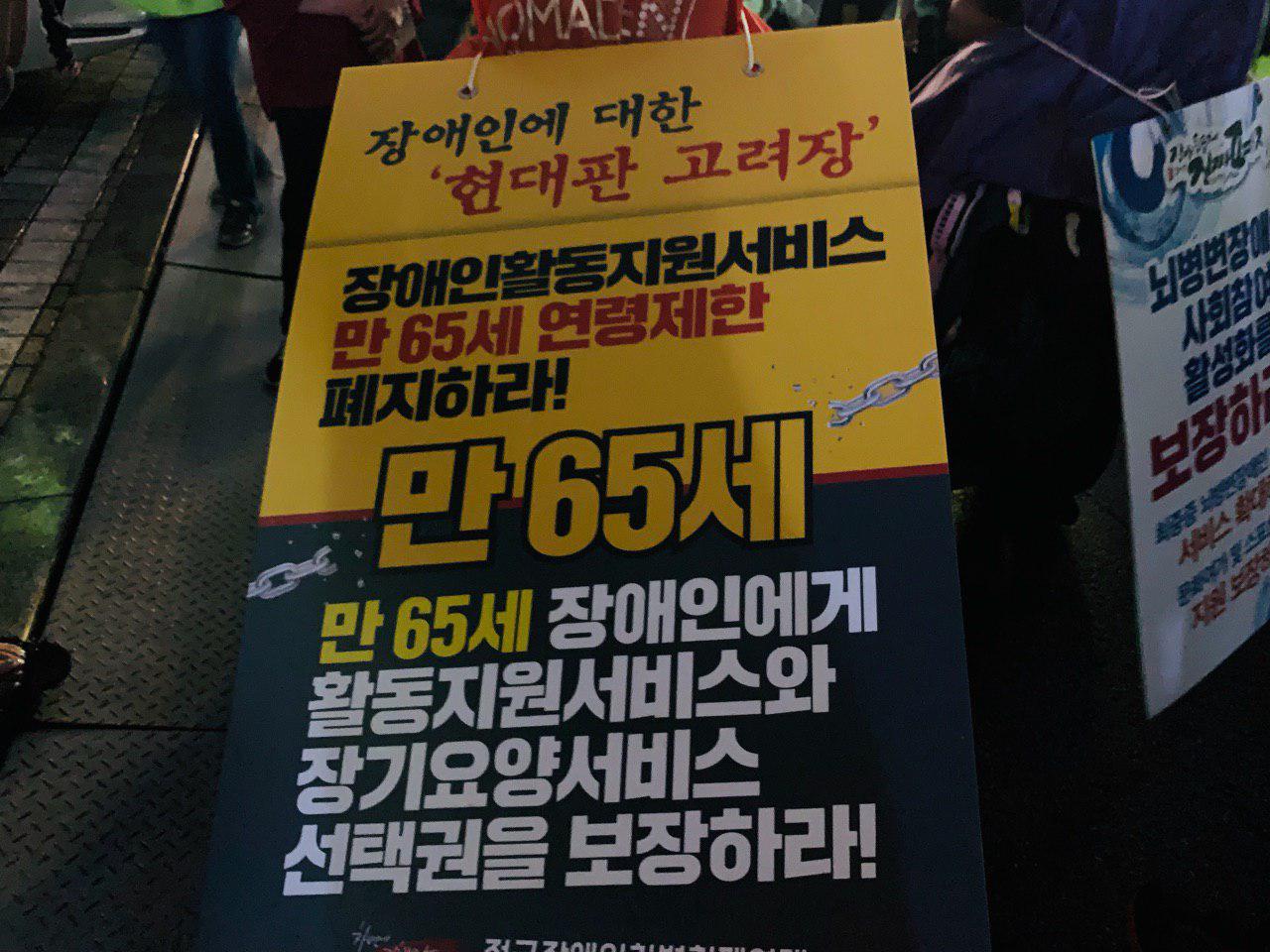 이게 말이 되는 소리입니까? 이렇게 말하고 있는 정부의 입장으로 한다면 중증장애인이 만65살이 되면 사회활동들을 접고 가정이나 요양원이나 시설에서 그렇게 살아가라고 하는 것과 같은 말입니다. 수십 년 동안 그렇게 자신들의 삶을 자신들의 의지와는 다르게 타의에 의해서 살아온 삶들인데, 이제 활동지원을 받아 이 사회에 나와서 소중한 자신의 삶을 살아가고자 하는데, 만65세가 되었다고 해서 그 옛날로 다시 돌아가라는 것은 말도 안되는 소리라고 생각을 합니다.